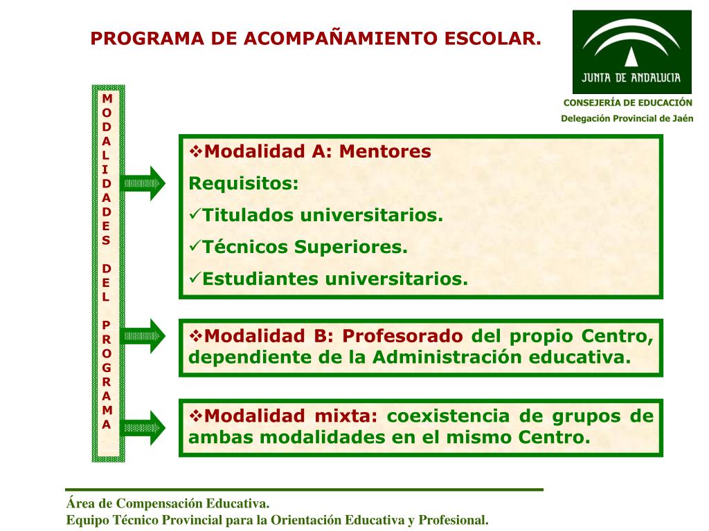 PROGRAMA DE ACOMPAÑAMIENTO ESCOLAR. MODALIDADES DEL PROGRAMA CONSEJERÍA DE EDUCACIÓN Delegación Provincial de Jaén • Modalidad A: Mentores Requisitos: • Titulados universitarios. • Técnicos Superiores. • Estudiantes universitarios. • Modalidad B: Profesorado del propio Centro, dependiente de la Administración educativa. • Modalidad mixta: coexistencia de grupos de ambas modalidades en el mismo Centro. Área de Compensación Educativa. Equipo Técnico Provincial para la Orientación Educativa y Profesional.