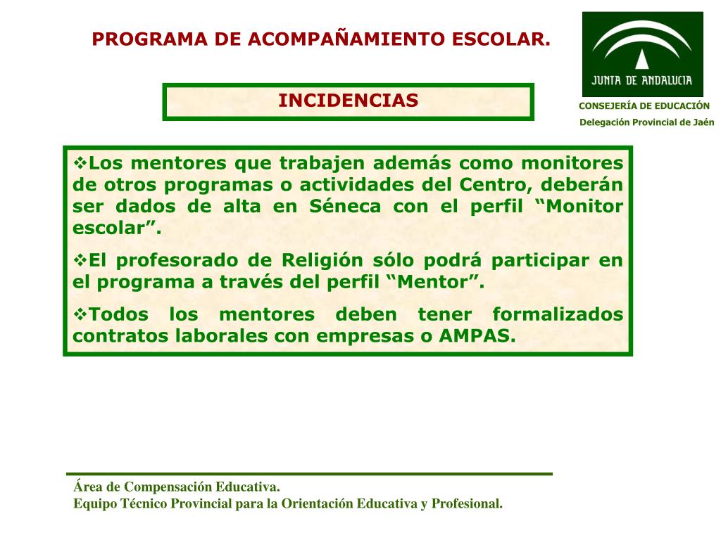 PROGRAMA DE ACOMPAÑAMIENTO ESCOLAR. INCIDENCIAS CONSEJERÍA DE EDUCACIÓN Delegación Provincial de Jaén • Los mentores que trabajen además como monitores de otros programas o actividades del Centro, deberán ser dados de alta en Séneca con el perfil “Monitor escolar”. • El profesorado de Religión sólo podrá participar en el programa a través del perfil “Mentor”. • Todos los mentores deben tener formalizados contratos laborales con empresas o AMPAS. Área de Compensación Educativa. Equipo Técnico Provincial para la Orientación Educativa y Profesional.