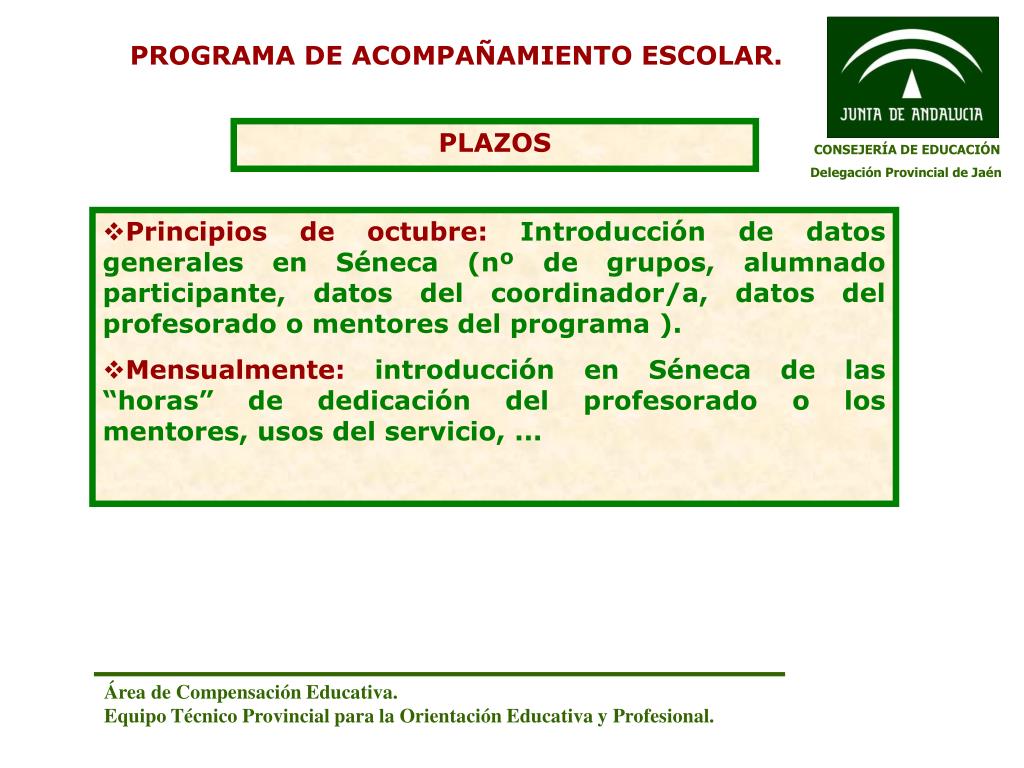 PROGRAMA DE ACOMPAÑAMIENTO ESCOLAR. PLAZOS CONSEJERÍA DE EDUCACIÓN Delegación Provincial de Jaén • Principios de octubre: Introducción de datos generales en Séneca (nº de grupos, alumnado participante, datos del coordinador/a, datos del profesorado o mentores del programa ). • Mensualmente: introducción en Séneca de las “horas” de dedicación del profesorado o los mentores, usos del servicio, ... Área de Compensación Educativa. Equipo Técnico Provincial para la Orientación Educativa y Profesional.