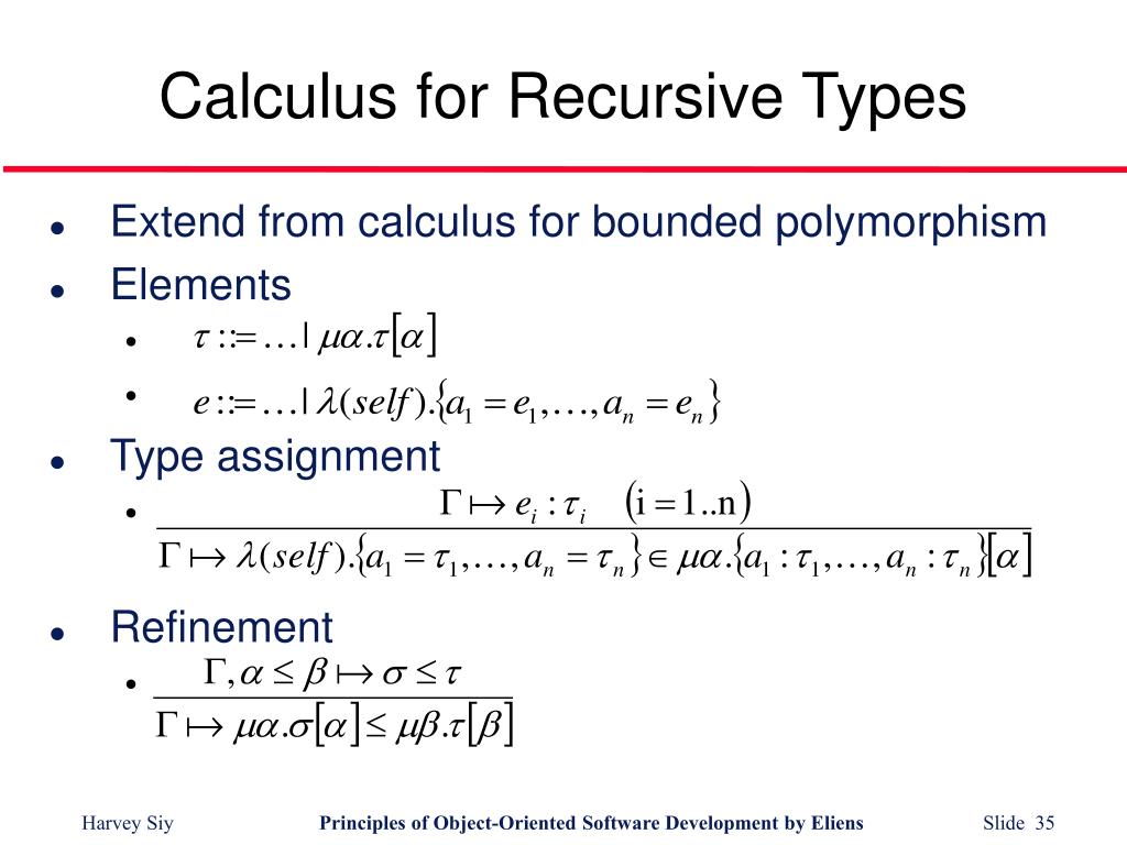 Calculus for Recursive Types • Extend from calculus for bounded polymorphism • Elements • Type assignment • Refinement