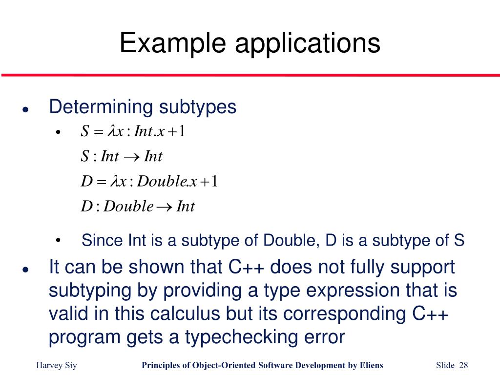 Example applications • Determining subtypes • Since Int is a subtype of Double, D is a subtype of S • It can be shown that C++ does not fully support subtyping by providing a type expression that is valid in this calculus but its corresponding C++ program gets a typechecking error