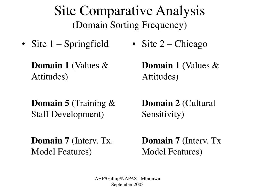 Site 1 – Springfield Domain 1 (Values & Attitudes) Domain 5 (Training & Staff Development) Domain 7 (Interv. Tx. Model Features) Site 2 – Chicago Domain 1 (Values & Attitudes) Domain 2 (Cultural Sensitivity) Domain 7 (Interv. Tx Model Features) Site Comparative Analysis(Domain Sorting Frequency) AHP/Gallup/NAPAS - Mbionwu September 2003