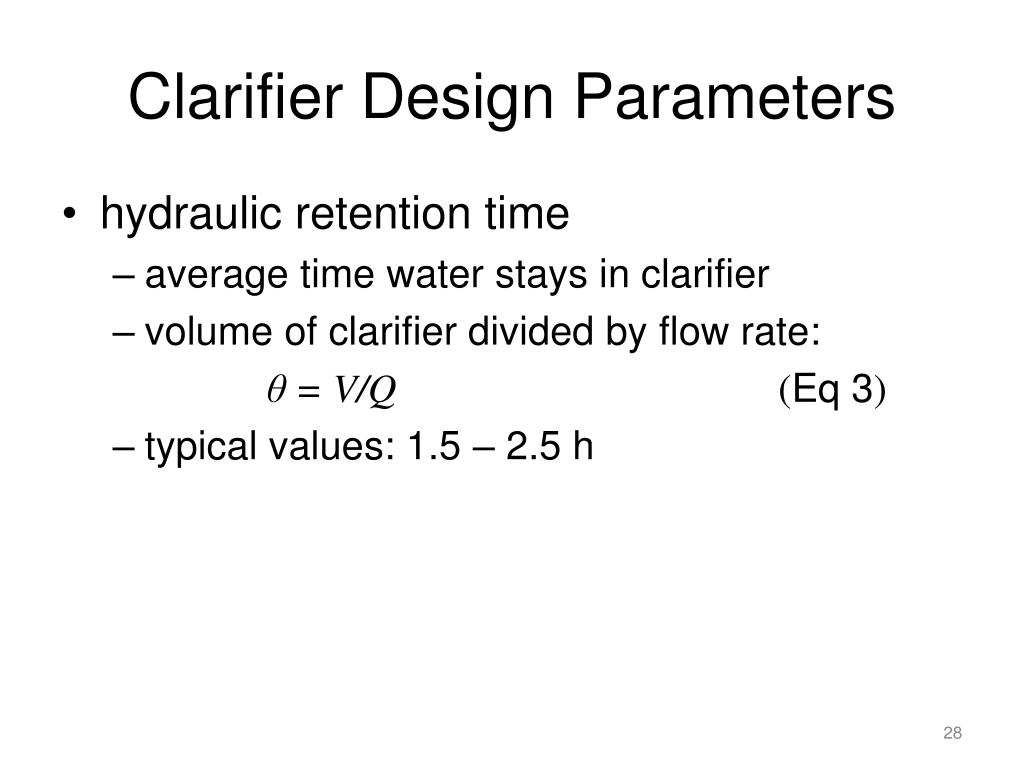 Clarifier Design Parameters • hydraulic retention time • average time water stays in clarifier • volume of clarifier divided by flow rate: θ = V/Q (Eq 3) • typical values: 1.5 – 2.5 h
