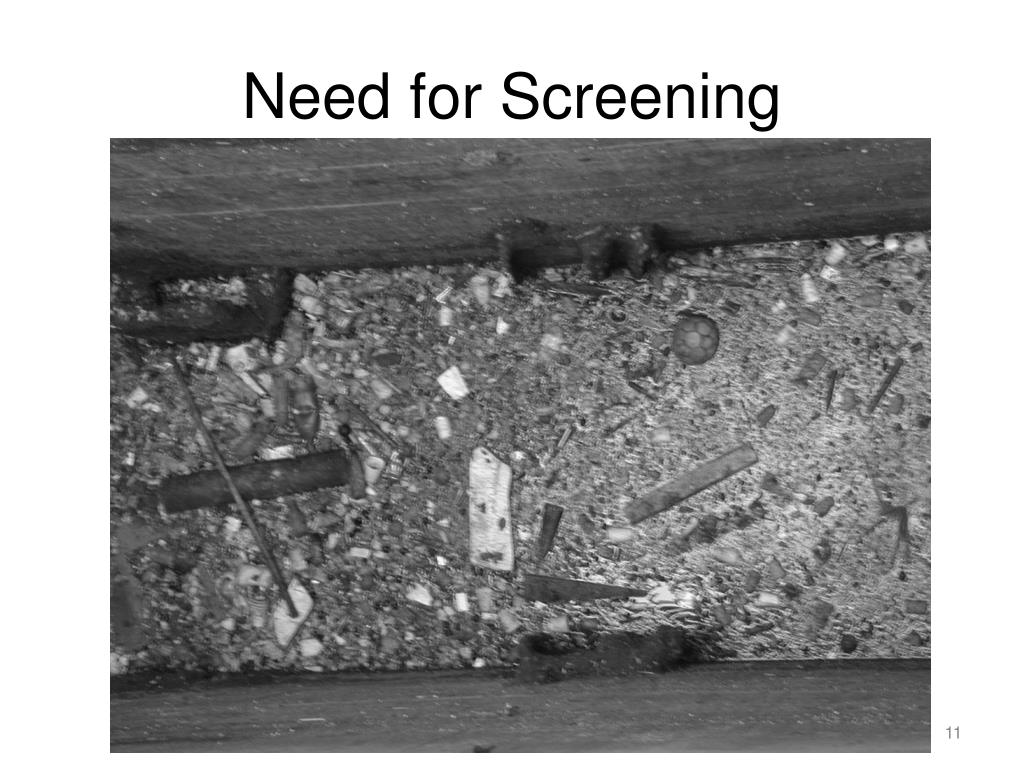 Primary Treatment • Screening • remove large objects (shoes, toys, branches) to keep from damaging pumps and pipes • typically use bar screens – vertical bars with narrow spacing to catch larger objects while allowing sediment and organic solids to pass • spacing from 0.5 cm to 4 cm • automatic rake or other mechanism to remove solids collected