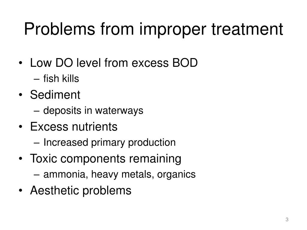 Problems from improper treatment • Low DO level from excess BOD • fish kills • Sediment • deposits in waterways • Excess nutrients • Increased primary production • Toxic components remaining • ammonia, heavy metals, organics • Aesthetic problems