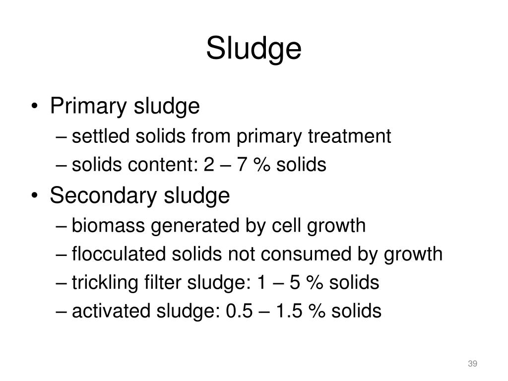 Sludge • Primary sludge • settled solids from primary treatment • solids content: 2 – 7 % solids • Secondary sludge • biomass generated by cell growth • flocculated solids not consumed by growth • trickling filter sludge: 1 – 5 % solids • activated sludge: 0.5 – 1.5 % solids