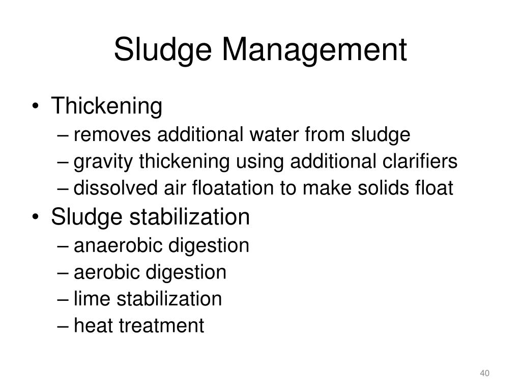 Sludge Management • Thickening • removes additional water from sludge • gravity thickening using additional clarifiers • dissolved air floatation to make solids float • Sludge stabilization • anaerobic digestion • aerobic digestion • lime stabilization • heat treatment