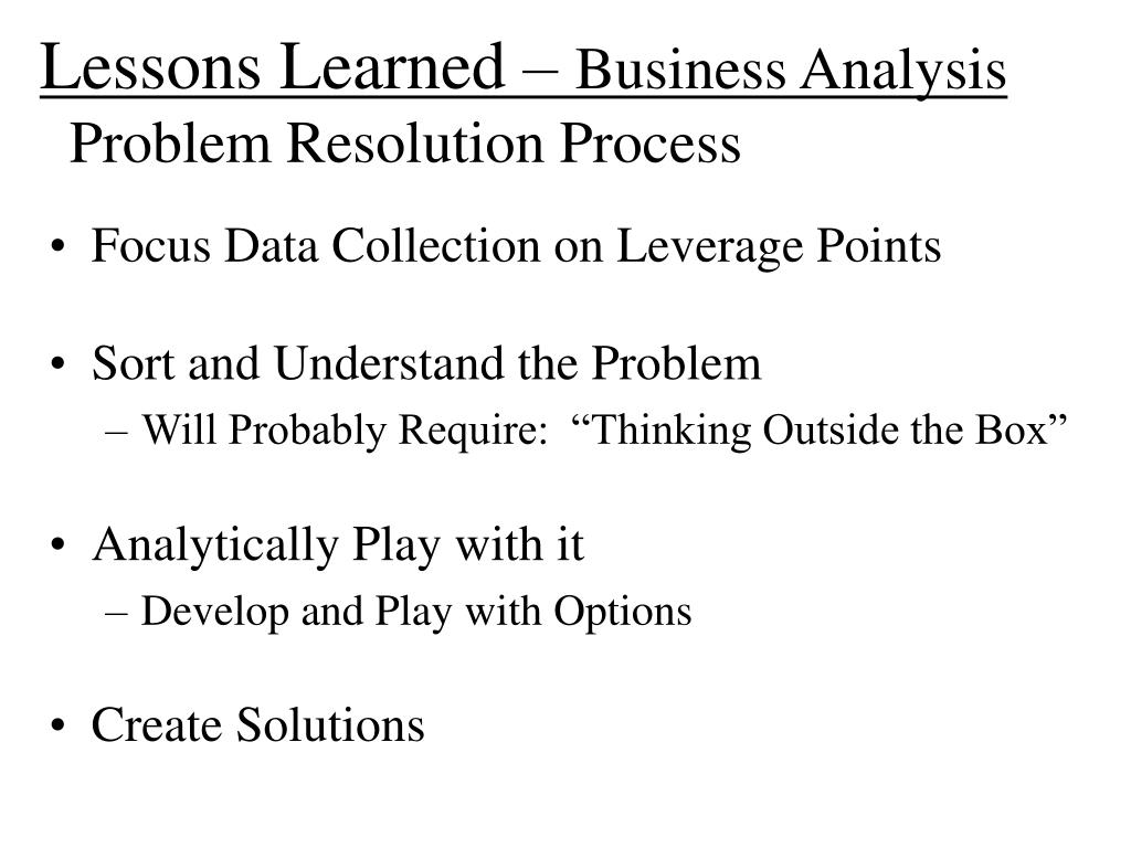 Lessons Learned – Business Analysis Problem Resolution Process • Focus Data Collection on Leverage Points • Sort and Understand the Problem • Will Probably Require: “Thinking Outside the Box” • Analytically Play with it • Develop and Play with Options • Create Solutions