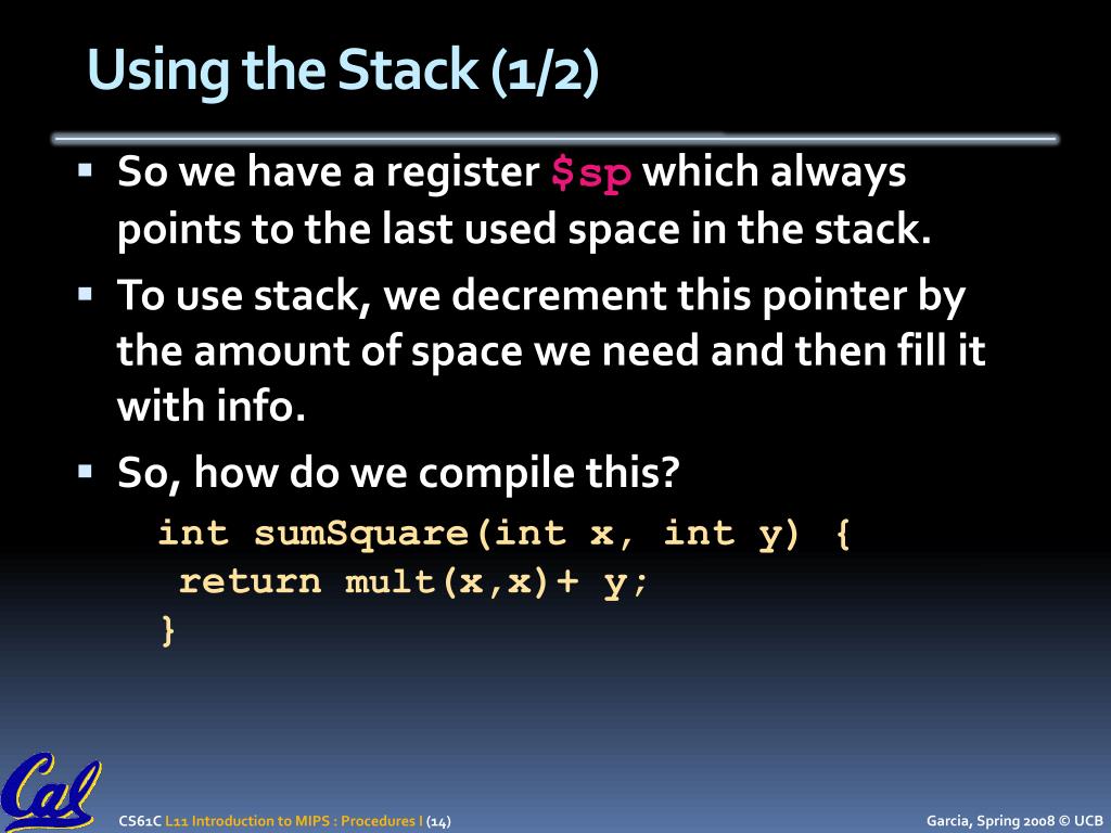 Using the Stack (1/2) • So we have a register $sp which always points to the last used space in the stack. • To use stack, we decrement this pointer by the amount of space we need and then fill it with info. • So, how do we compile this? intsumSquare(intx, inty) { return mult(x,x)+ y;}