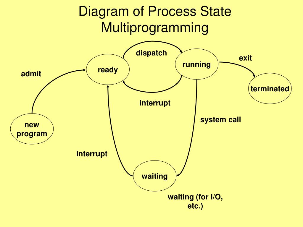 Diagram of Process StateMultiprogramming dispatch running exit ready admit terminated interrupt system call new program interrupt waiting waiting (for I/O, etc.)