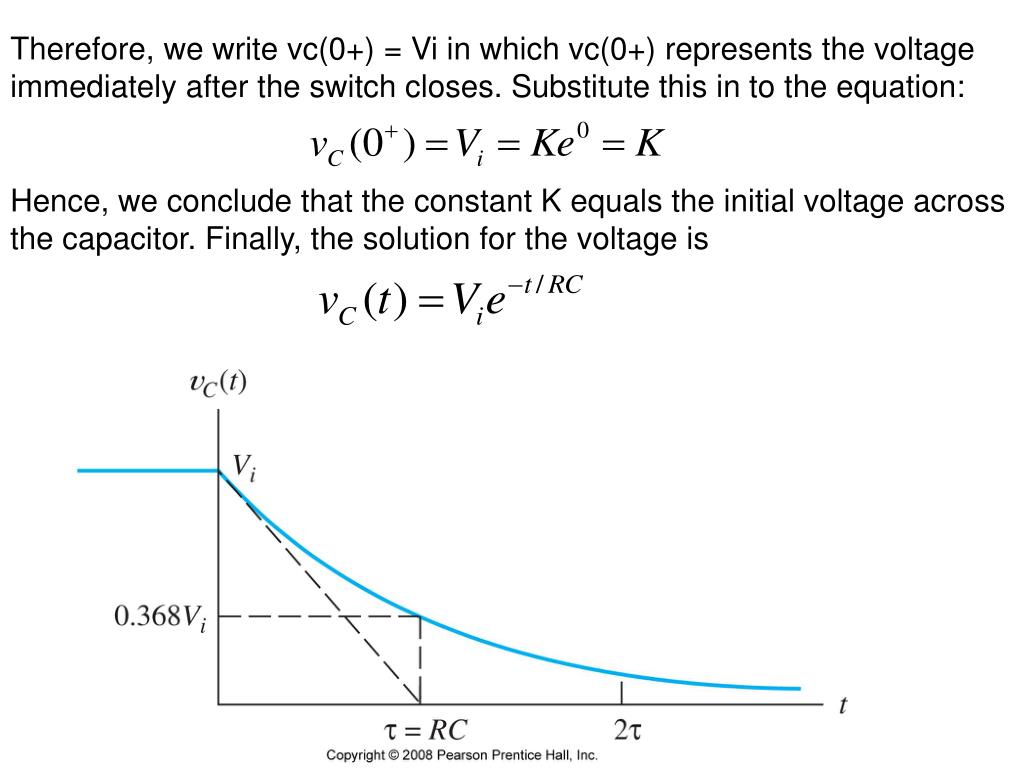 Therefore, we write vc(0+) = Vi in which vc(0+) represents the voltage immediately after the switch closes. Substitute this in to the equation: Hence, we conclude that the constant K equals the initial voltage across the capacitor. Finally, the solution for the voltage is