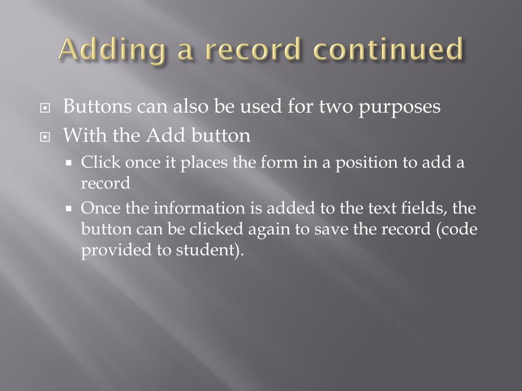 Adding a record continued • Buttons can also be used for two purposes • With the Add button • Click once it places the form in a position to add a record • Once the information is added to the text fields, the button can be clicked again to save the record (code provided to student).