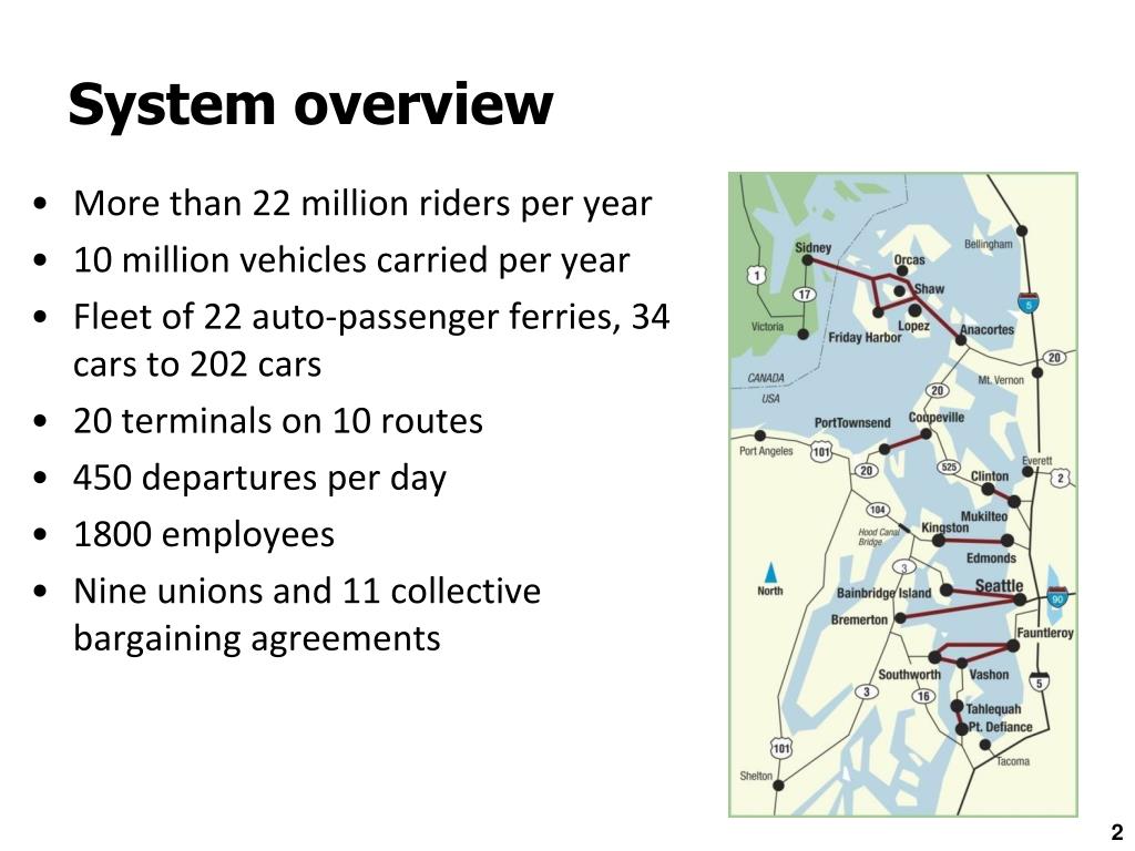 System overview • More than 22 million riders per year • 10 million vehicles carried per year • Fleet of 22auto-passenger ferries, 34 cars to 202 cars • 20 terminals on 10 routes • 450 departures per day • 1800 employees • Nine unions and 11 collective bargaining agreements 2