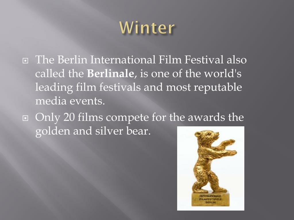 Winter • The Berlin International Film Festival also called the Berlinale, is one of the world's leading film festivals and most reputable media events. • Only 20 films compete for the awards the golden and silver bear.