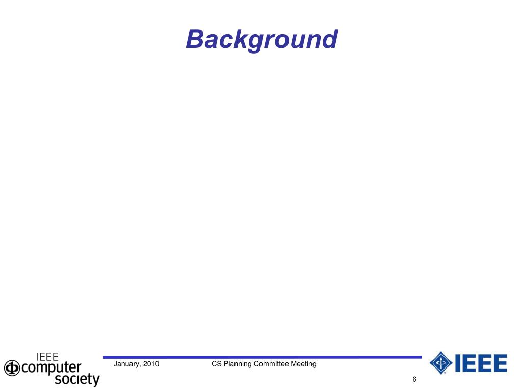 Background details • Keep in touch with our CSC Chairs with online surveys • CS Full Service Conference Business service should include • license for a good peer-review system • content management system for input into proceedings production and CD-ROM for Xplore • conference registration information imported into TECA • Benchmark low cost conference business models, e.g. International Quality and Productive Center (IQPC) • Understand registration fee elasticity due to conference maturity / life cycle January, 2010 CS Planning Committee Meeting