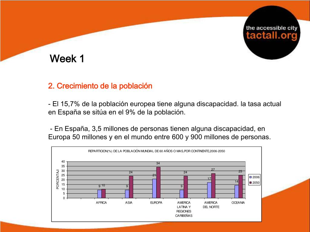 Week 1 2. Crecimiento de la población - El 15,7% de la población europea tiene alguna discapacidad. la tasa actual en España se sitúa en el 9% de la población. - En España, 3,5 millones de personas tienen alguna discapacidad, en Europa 50 millones y en el mundo entre 600 y 900 millones de personas.