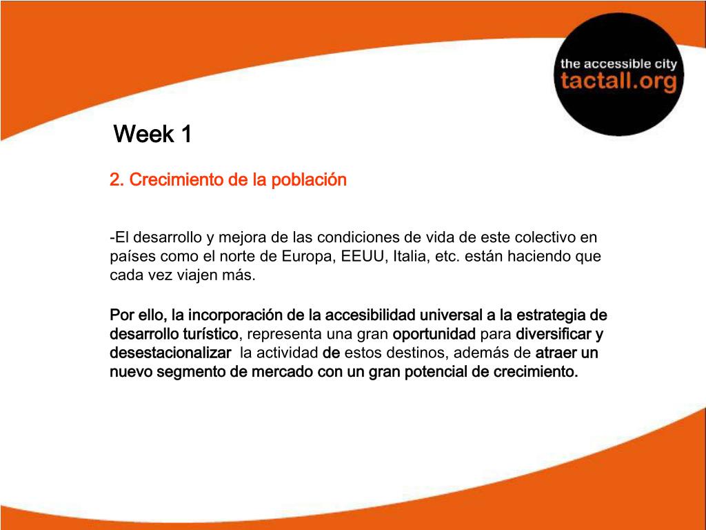 Week 1 • 2. Crecimiento de la población • Tomando en cuenta a las personas con diversidad funcional, entre el 30 y 40% de todos los europeos podrían beneficiarse en gran medida de la accesibilidad en el turismo. • - El fomento del empleo y la mejora en la calidad de vida de este segmento de población hacen que participen en cada vez más ámbitos de la sociedad.