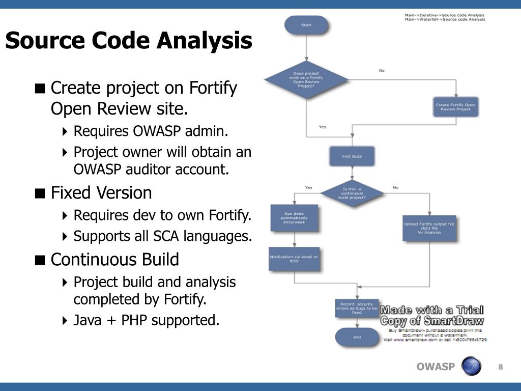 Source Code Analysis Create project on Fortify Open Review site. Requires OWASP admin. Project owner will obtain an OWASP auditor account. Fixed Version Requires dev to own Fortify. Supports all SCA languages. Continuous Build Project build and analysis completed by Fortify. Java + PHP supported.