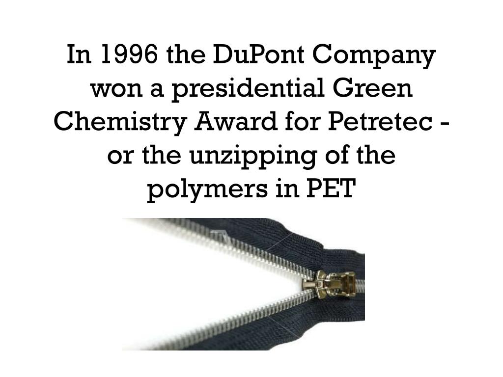 In 1996 the DuPont Company won a presidential Green Chemistry Award for Petretec -or the unzipping of the polymers in PET