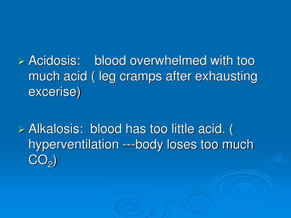 Acidosis: blood overwhelmed with too much acid ( leg cramps after exhausting excerise) • Alkalosis: blood has too little acid. ( hyperventilation ---body loses too much CO2)