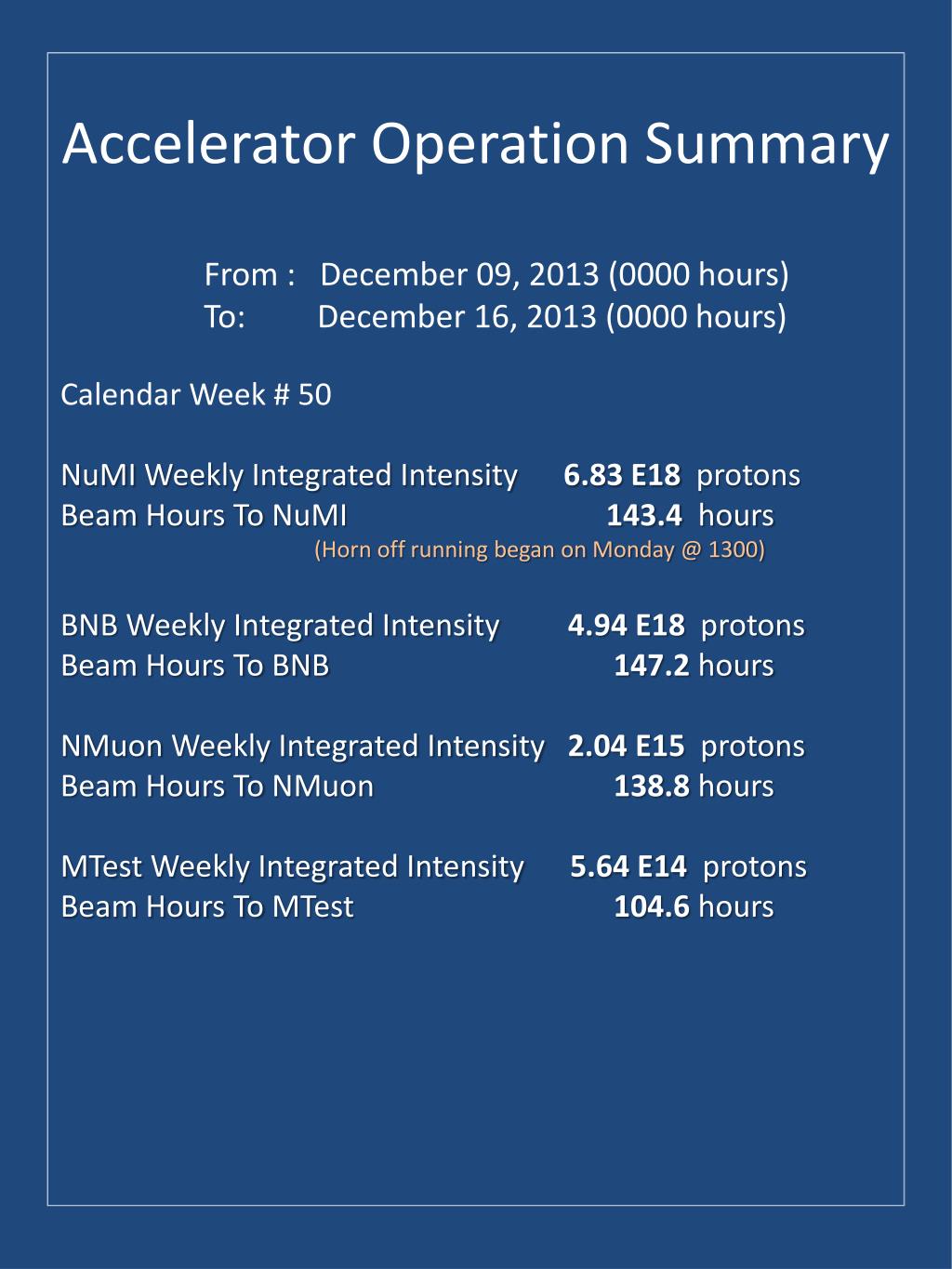 Accelerator Operation Summary From : December 09, 2013 (0000 hours) To: December 16, 2013 (0000 hours) Calendar Week # 50 NuMI Weekly Integrated Intensity 6.83 E18 protons Beam Hours To NuMI143.4 hours (Horn off running began on Monday @ 1300) BNB Weekly Integrated Intensity 4.94 E18 protons Beam Hours To BNB 147.2hours NMuonWeekly Integrated Intensity 2.04 E15 protons Beam Hours To NMuon138.8 hours MTest Weekly Integrated Intensity 5.64 E14 protons Beam Hours To MTest104.6hours