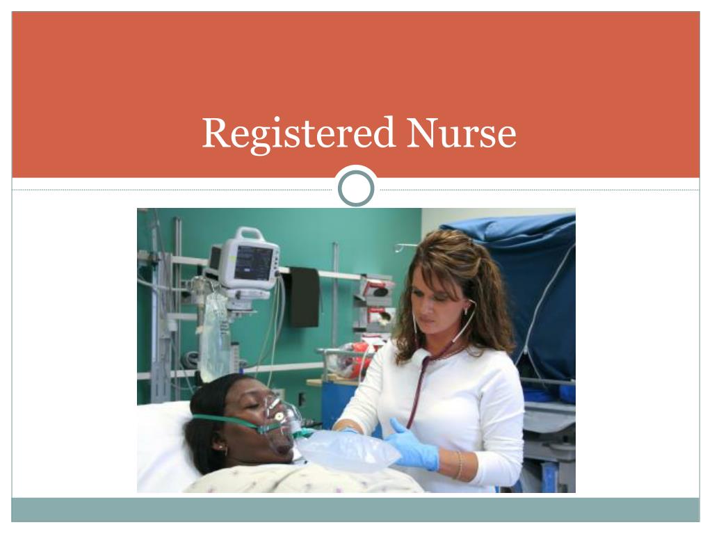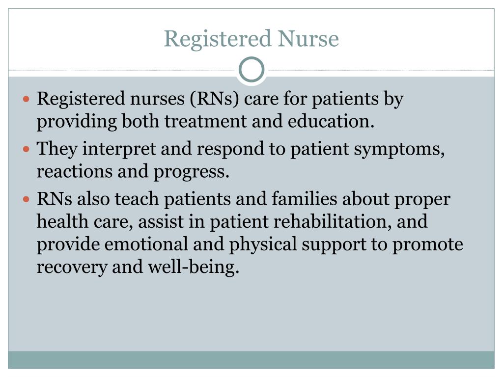 Registered Nurse • Registered nurses (RNs) care for patients by providing both treatment and education. • They interpret and respond to patient symptoms, reactions and progress. • RNs also teach patients and families about proper health care, assist in patient rehabilitation, and provide emotional and physical support to promote recovery and well-being.