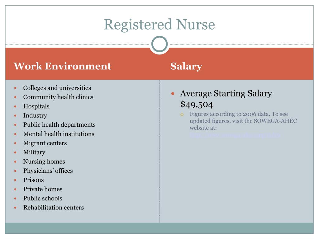 Registered Nurse Work Environment Salary • Colleges and universities • Community health clinics • Hospitals • Industry • Public health departments • Mental health institutions • Migrant centers • Military • Nursing homes • Physicians’ offices • Prisons • Private homes • Public schools • Rehabilitation centers • Average Starting Salary $49,504 • Figures according to 2006 data. To see updated figures, visit the SOWEGA-AHEC website at:http://www.sowega-ahec.org/index