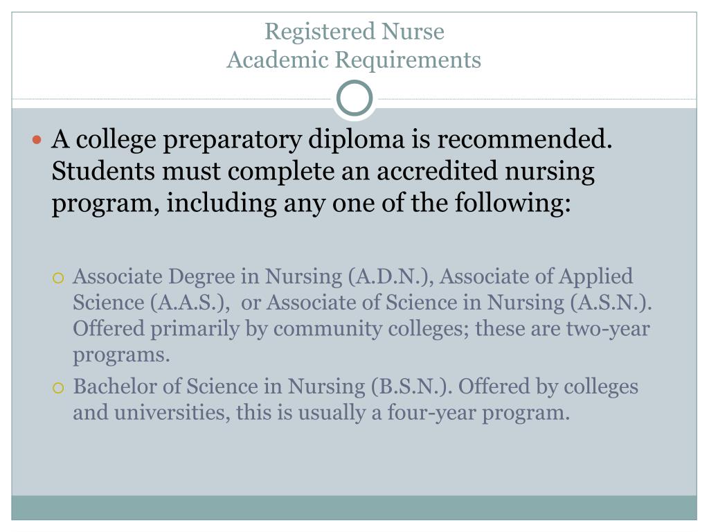 Registered NurseAcademic Requirements • A college preparatory diploma is recommended. Students must complete an accredited nursing program, including any one of the following: • Associate Degree in Nursing (A.D.N.), Associate of Applied Science (A.A.S.), or Associate of Science in Nursing (A.S.N.). Offered primarily by community colleges; these are two-year programs. • Bachelor of Science in Nursing (B.S.N.). Offered by colleges and universities, this is usually a four-year program.