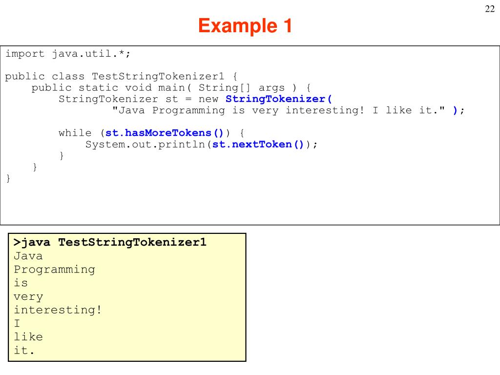 Example 1 import java.util.*; public class TestStringTokenizer1 { public static void main( String[] args ) { StringTokenizer st = new StringTokenizer( "Java Programming is very interesting! I like it." ); while (st.hasMoreTokens()) { System.out.println(st.nextToken()); } } } >java TestStringTokenizer1 Java Programming is very interesting! I like it.
