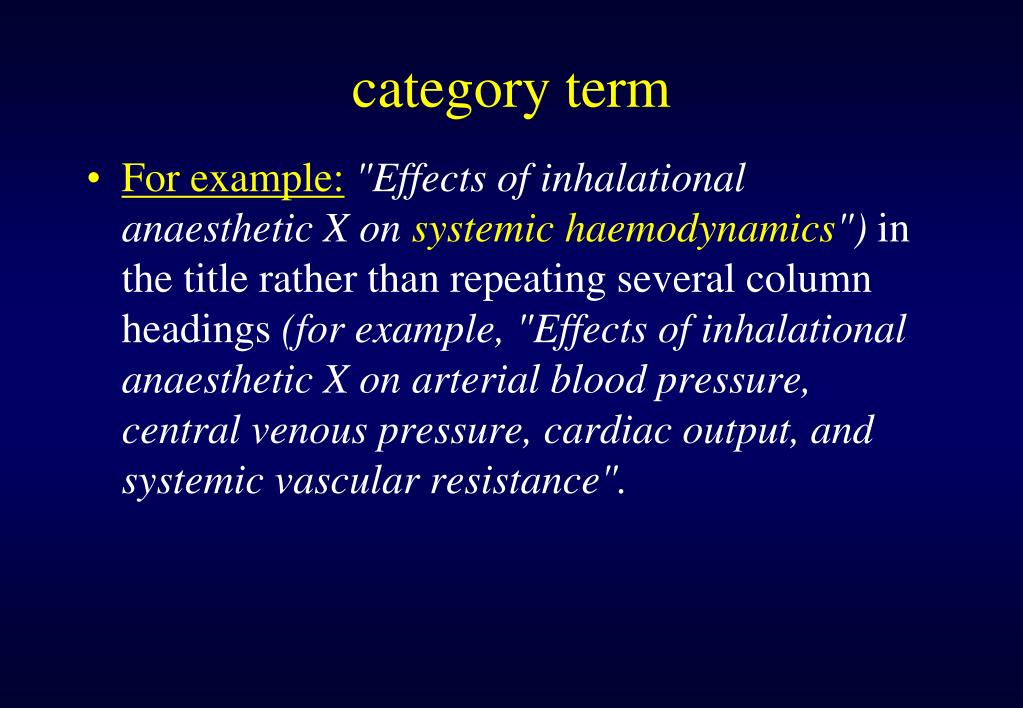 category term • For example:"Effects of inhalational anaesthetic X on systemic haemodynamics") in the title rather than repeating several column headings (for example, "Effects of inhalational anaesthetic X on arterial blood pressure, central venous pressure, cardiac output, and systemic vascular resistance".
