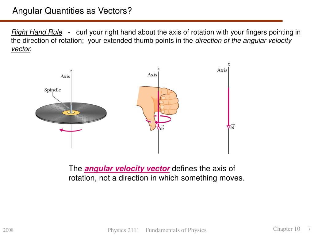 Angular Quantities as Vectors? Right Hand Rule - curl your right hand about the axis of rotation with your fingers pointing in the direction of rotation; your extended thumb points in the direction of the angular velocity vector. The angular velocity vector defines the axis of rotation, not a direction in which something moves. Physics 2111 Fundamentals of Physics