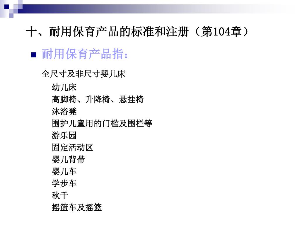 十、耐用保育产品的标准和注册(第104章) • 耐用保育产品指: 全尺寸及非尺寸婴儿床 幼儿床 高脚椅、升降椅、悬挂椅 沐浴凳 围护儿童用的门槛及围栏等 游乐园 固定活动区 婴儿背带 婴儿车 学步车 秋千 摇篮车及摇篮
