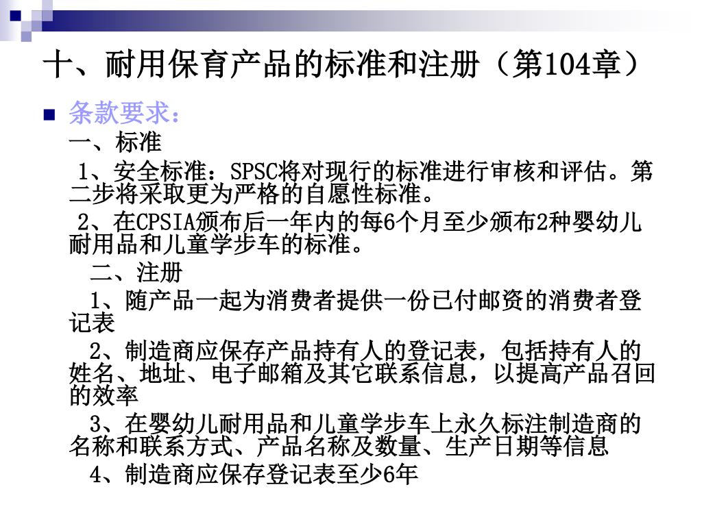 十、耐用保育产品的标准和注册(第104章) • 条款要求: 一、标准 1、安全标准:SPSC将对现行的标准进行审核和评估。第二步将采取更为严格的自愿性标准。 2、在CPSIA颁布后一年内的每6个月至少颁布2种婴幼儿耐用品和儿童学步车的标准。 二、注册 1、随产品一起为消费者提供一份已付邮资的消费者登记表 2、制造商应保存产品持有人的登记表,包括持有人的姓名、地址、电子邮箱及其它联系信息,以提高产品召回的效率 3、在婴幼儿耐用品和儿童学步车上永久标注制造商的名称和联系方式、产品名称及数量、生产日期等信息 4、制造商应保存登记表至少6年
