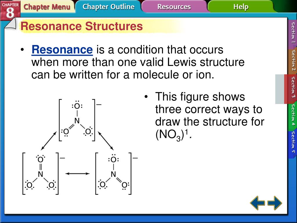Resonance Structures Resonanceis a condition that occurs when more than one valid Lewis structure can be written for a molecule or ion. This figure shows three correct ways to draw the structure for (NO3)1. Section 8-3