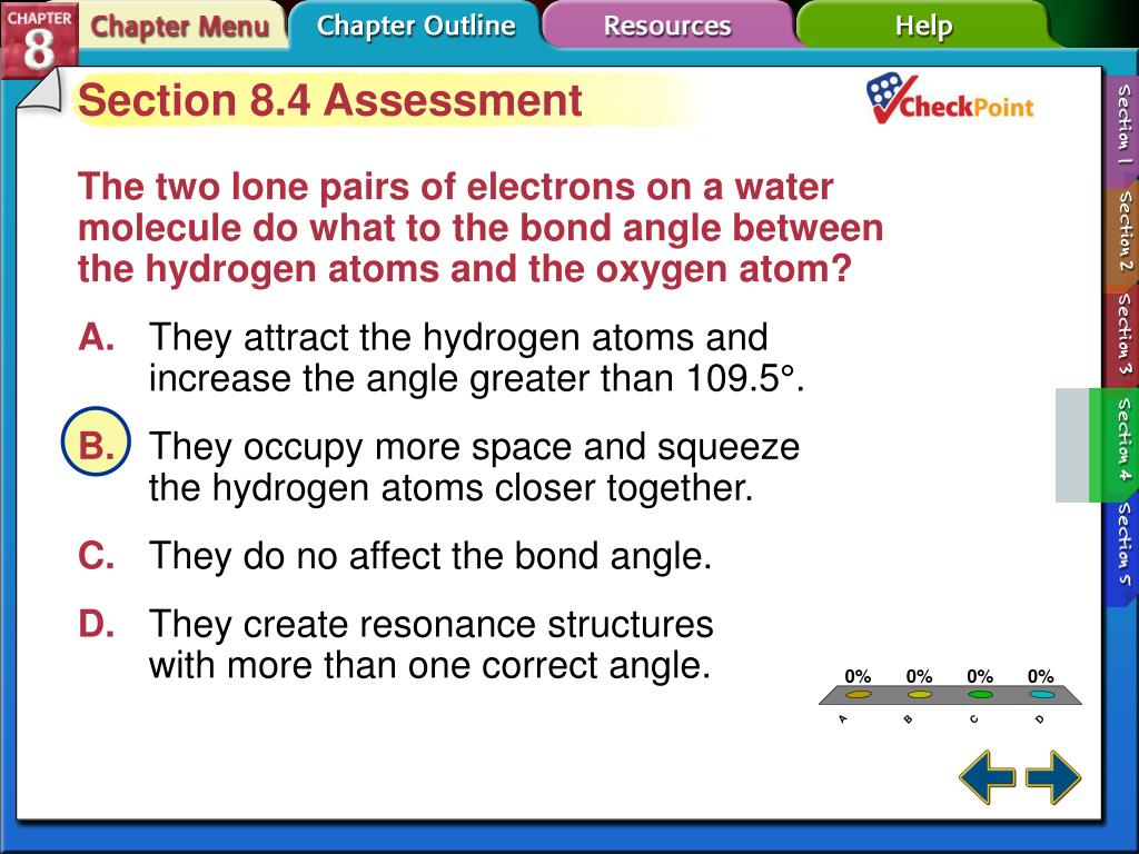 A B C D Section 8.4 Assessment The two lone pairs of electrons on a water molecule do what to the bond angle between the hydrogen atoms and the oxygen atom? A.They attract the hydrogen atoms and increase the angle greater than 109.5°. B.They occupy more space and squeeze the hydrogen atoms closer together. C.They do no affect the bond angle. D.They create resonance structures with more than one correct angle. Section 8-4