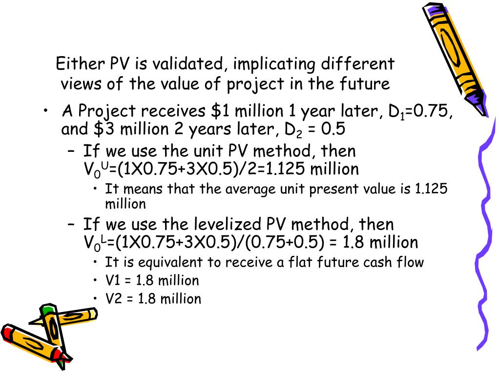 Either PV is validated, implicating different views of the value of project in the future • A Project receives $1 million 1 year later, D1=0.75, and $3 million 2 years later, D2 = 0.5 • If we use the unit PV method, then V0U=(1X0.75+3X0.5)/2=1.125 million • It means that the average unit present value is 1.125 million • If we use the levelized PV method, then V0L=(1X0.75+3X0.5)/(0.75+0.5) = 1.8 million • It is equivalent to receive a flat future cash flow • V1 = 1.8 million • V2 = 1.8 million