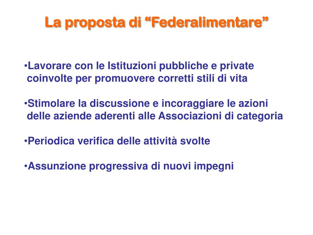 La proposta di “Federalimentare” • Lavorare con le Istituzioni pubbliche e private • coinvolte per promuovere corretti stili di vita • Stimolare la discussione e incoraggiare le azioni • delle aziende aderenti alle Associazioni di categoria • Periodica verifica delle attività svolte • Assunzione progressiva di nuovi impegni