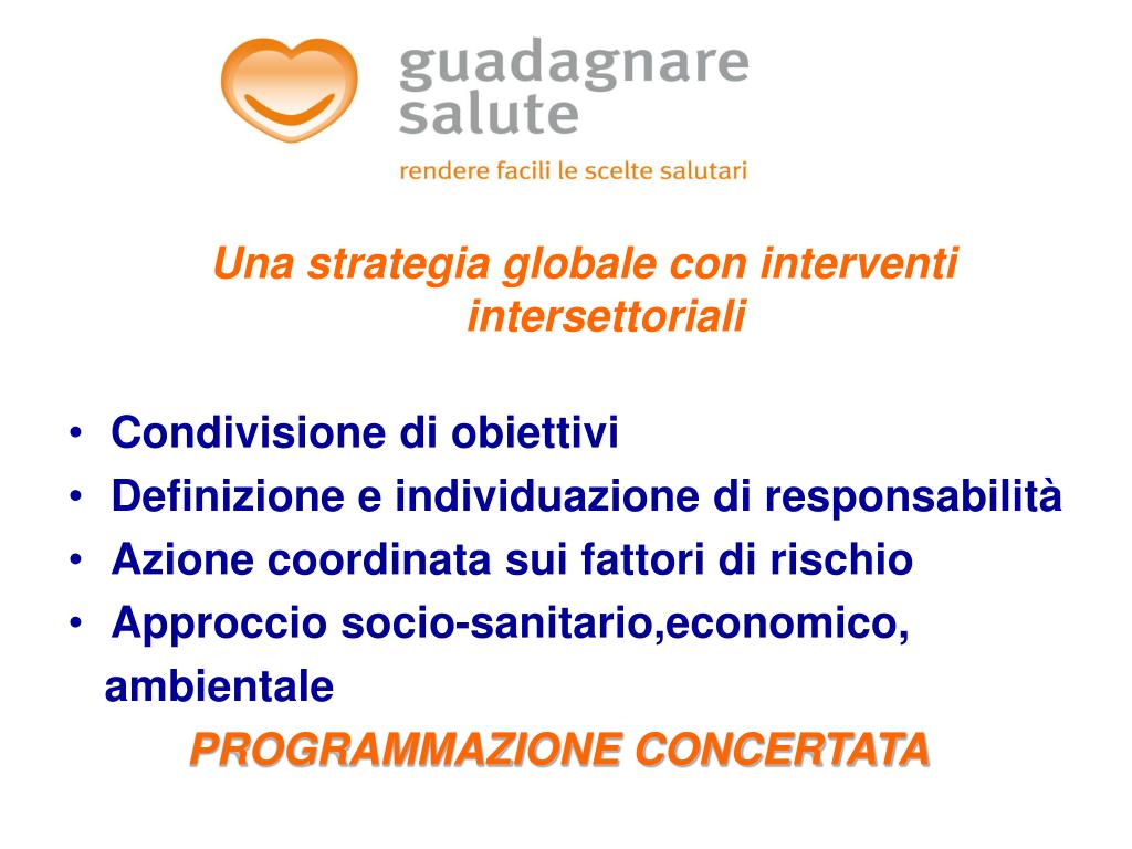 Una strategia globale con interventi intersettoriali • Condivisione di obiettivi • Definizione e individuazione di responsabilità • Azione coordinata sui fattori di rischio • Approccio socio-sanitario,economico, ambientale PROGRAMMAZIONE CONCERTATA