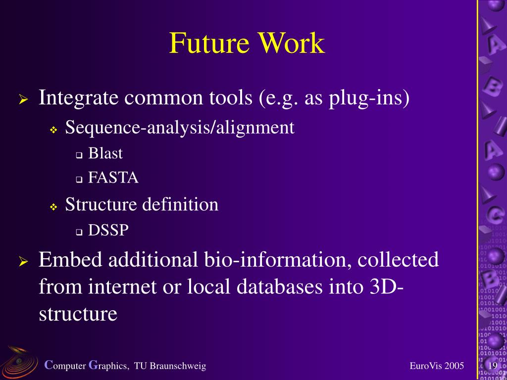 Future Work • Integrate common tools (e.g. as plug-ins) • Sequence-analysis/alignment • Blast • FASTA • Structure definition • DSSP • Embed additional bio-information, collected from internet or local databases into 3D-structure