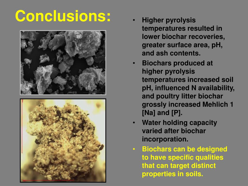 Conclusions: Higher pyrolysis temperatures resulted in lower biochar recoveries, greater surface area, pH, and ash contents. Biochars produced at higher pyrolysis temperatures increased soil pH, influenced N availability, and poultry litter biochar grossly increased Mehlich 1 [Na] and [P]. Water holding capacity varied after biochar incorporation. Biochars can be designed to have specific qualities that can target distinct properties in soils.