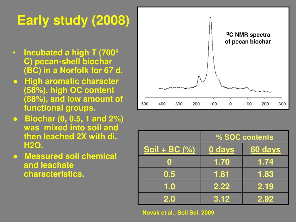 % SOC contents Soil + BC (%) 0 days 60 days 0 1.70 1.74 0.5 1.81 1.83 1.0 2.22 2.19 2.0 3.12 2.92 Early study (2008) 13C NMR spectra of pecan biochar • Incubated a high T (700º C) pecan-shell biochar (BC) in a Norfolk for 67 d. ● High aromatic character (58%), high OC content (88%), and low amount of functional groups. ● Biochar (0, 0.5, 1 and 2%) was mixed into soil and then leached 2X with di. H2O. ● Measured soil chemical and leachate characteristics. Novak et al., Soil Sci. 2009