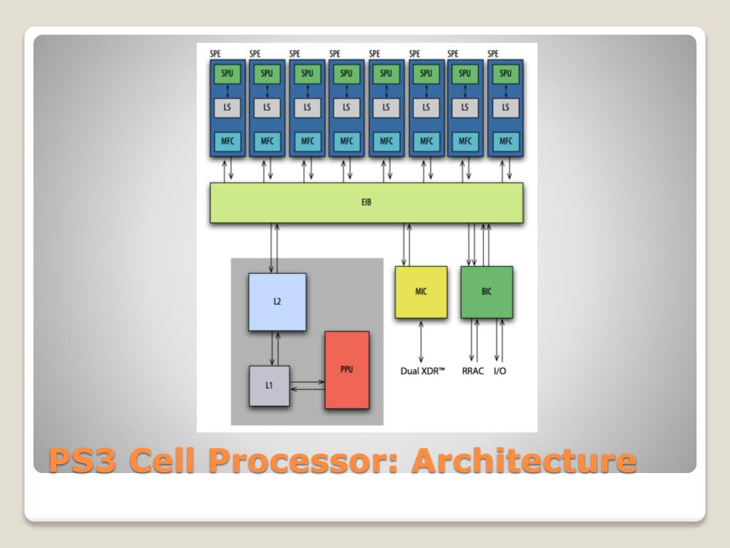 Power Processing Element (PPE) • Synergistic Processing Element (SPE) • Element Interconnection Bus (EIB) • Memory System • Network Card & Graphics Card PS3 Cell Processor: Architecture
