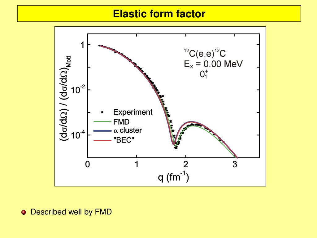12C densities ↔ • Ground state density can be • tested via elastic form factor ↔ • Transition density can be tested • via transition form factor FMD : R. Roth, T. Neff, H. Hergert, and H. Feldmeier, Nucl. Phys. A745 (2004) 3 • “BEC”: Y. Funaki et al., Phys. Rev. C 67 (2003) 051306(R)