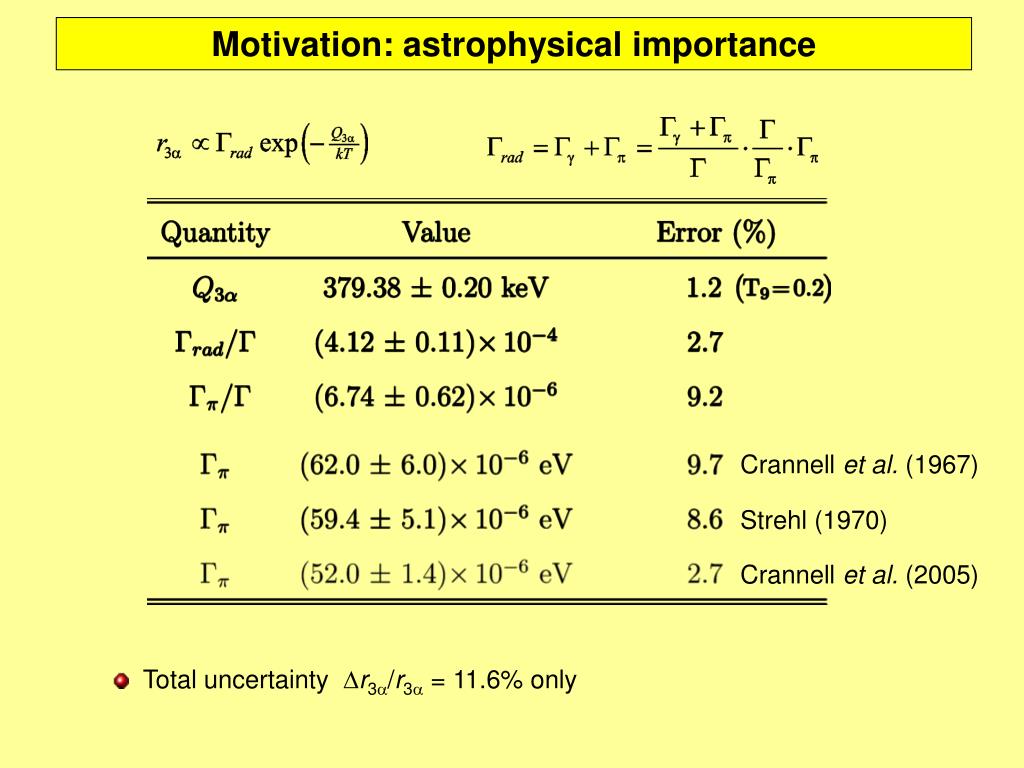 Motivation: astrophysical importance Crannell et al. (1967) Strehl (1970) Crannell et al. (2005) • Total uncertainty Dr3a/r3a = 11.6% only