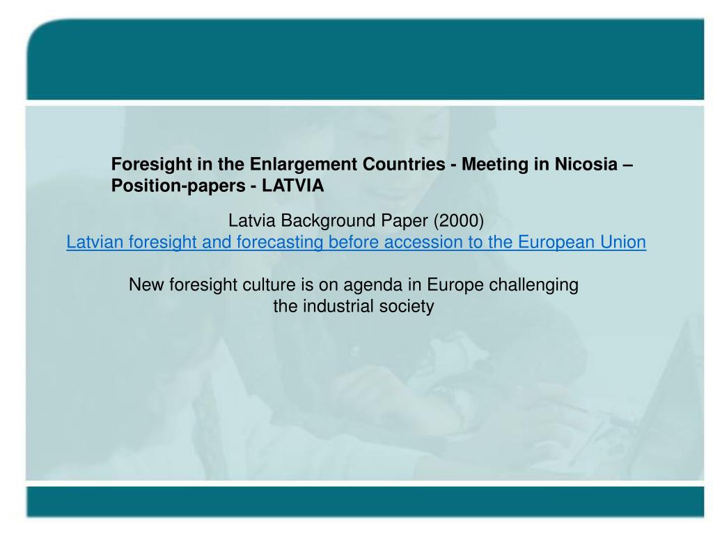 Foresight in the Enlargement Countries - Meeting in Nicosia – Position-papers - LATVIA Latvia Background Paper (2000) Latvian foresight and forecasting before accession to the European UnionNew foresight culture is on agenda in Europe challenging the industrial society