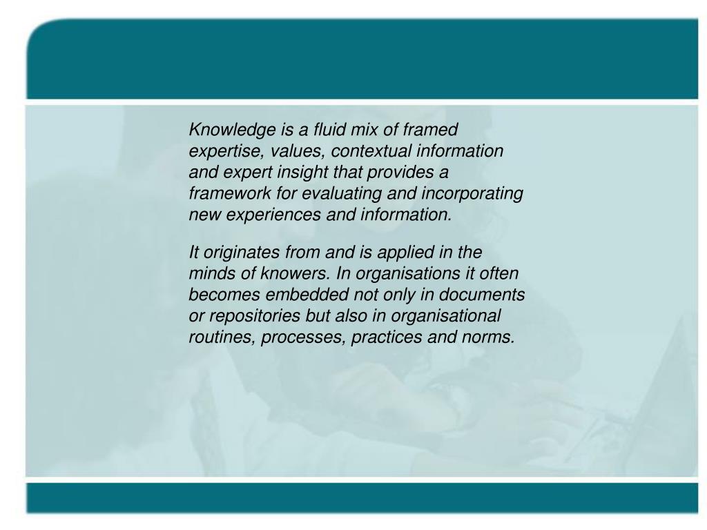 Knowledge is a fluid mix of framed expertise, values, contextual information and expert insight that provides a framework for evaluating and incorporating new experiences and information. It originates from and is applied in the minds of knowers. In organisations it often becomes embedded not only in documents or repositories but also in organisational routines, processes, practices and norms. Davenport T. & Prusak L, 1998: Working Knowledge: Harvard Business School Press