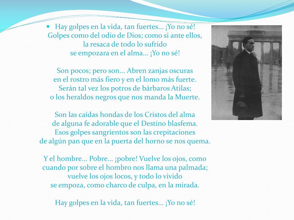 Hay golpes en la vida, tan fuertes... ¡Yo no sé!Golpes como del odio de Dios; como si ante ellos,la resaca de todo lo sufridose empozara en el alma... ¡Yo no sé!Son pocos; pero son... Abren zanjas oscurasen el rostro más fiero y en el lomo más fuerte.Serán tal vez los potros de bárbaros Atilas;o los heraldos negros que nos manda la Muerte.Son las caídas hondas de los Cristos del almade alguna fe adorable que el Destino blasfema.Esos golpes sangrientos son las crepitacionesde algún pan que en la puerta del horno se nos quema.Y el hombre... Pobre... ¡pobre! Vuelve los ojos, comocuando por sobre el hombro nos llama una palmada;vuelve los ojos locos, y todo lo vividose empoza, como charco de culpa, en la mirada.Hay golpes en la vida, tan fuertes... ¡Yo no sé!