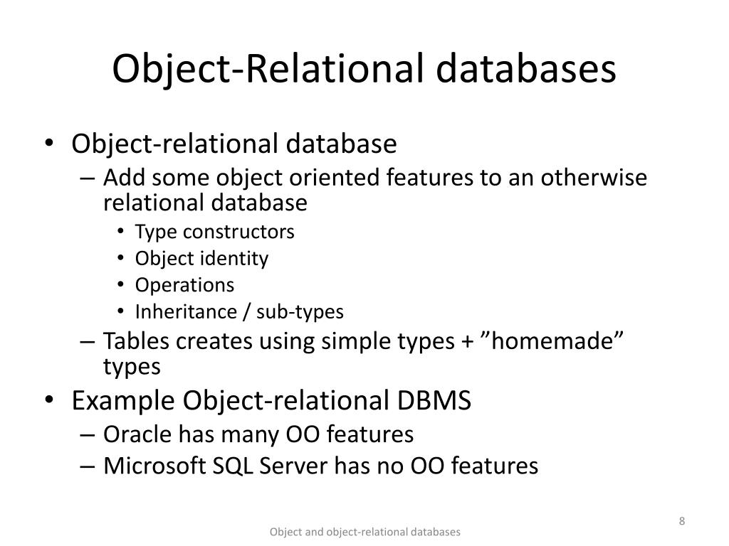 Object-Relational databases • Object-relational database • Add some object oriented features to an otherwise relational database • Type constructors • Object identity • Operations • Inheritance / sub-types • Tables creates using simple types + ”homemade” types • Example Object-relational DBMS • Oracle has many OO features • Microsoft SQL Server has no OO features Object and object-relational databases
