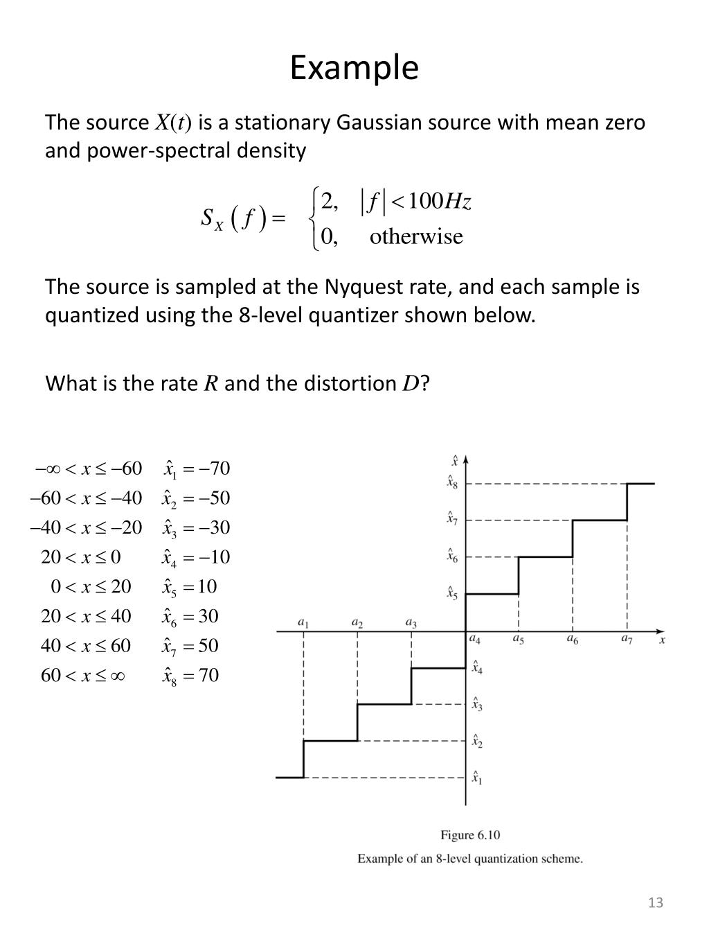 Example • The source X(t) is a stationary Gaussian source with mean zero and power-spectral density • The source is sampled at the Nyquest rate, and each sample is quantized using the 8-level quantizer shown below. • What is the rate R and the distortion D?