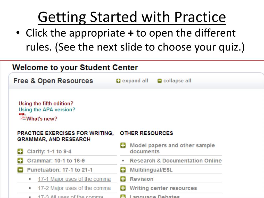 Getting Started with Practice • Click the appropriate + to open the different rules. (See the next slide to choose your quiz.)